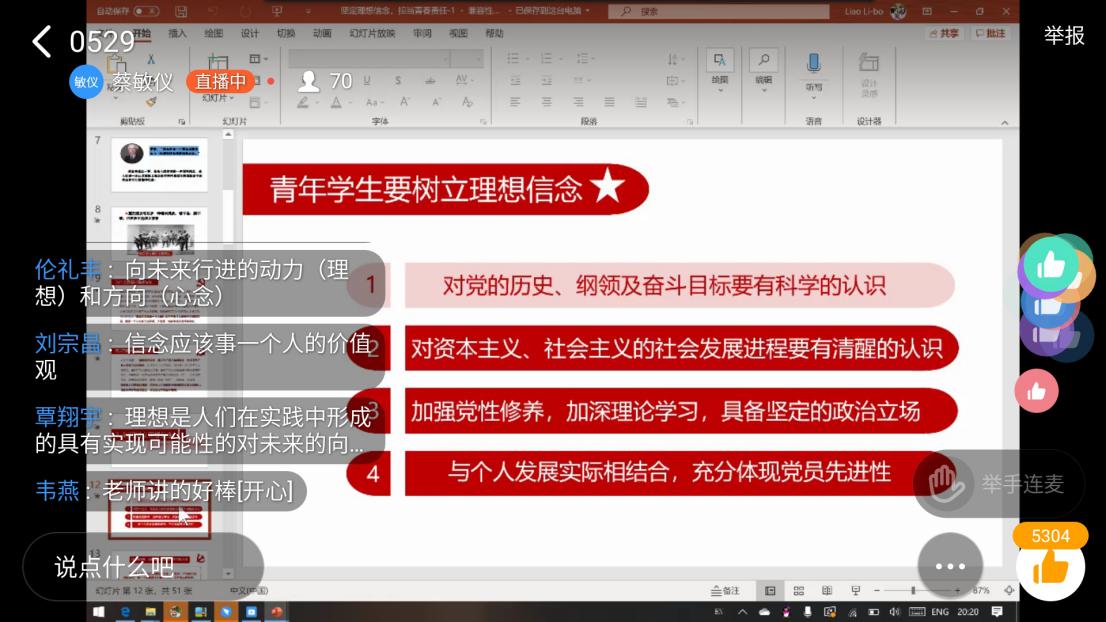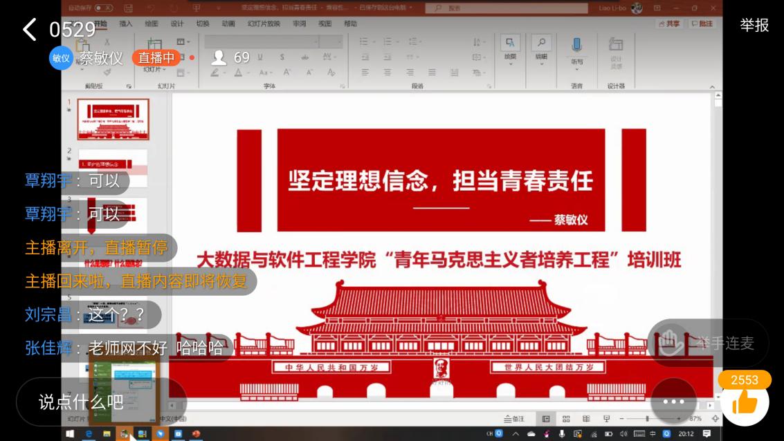 为进一步树立当代青年大学生"青春、奋斗、责任、担当”的时代精神,引导广大青少年坚定理想信念,5月29日晚,学院思政辅导员蔡敏仪老师以“坚定理想信念,担当青春责任”为主题在线上给院“青年马克思主义者培养工程”培训班的学员上了第一堂课。